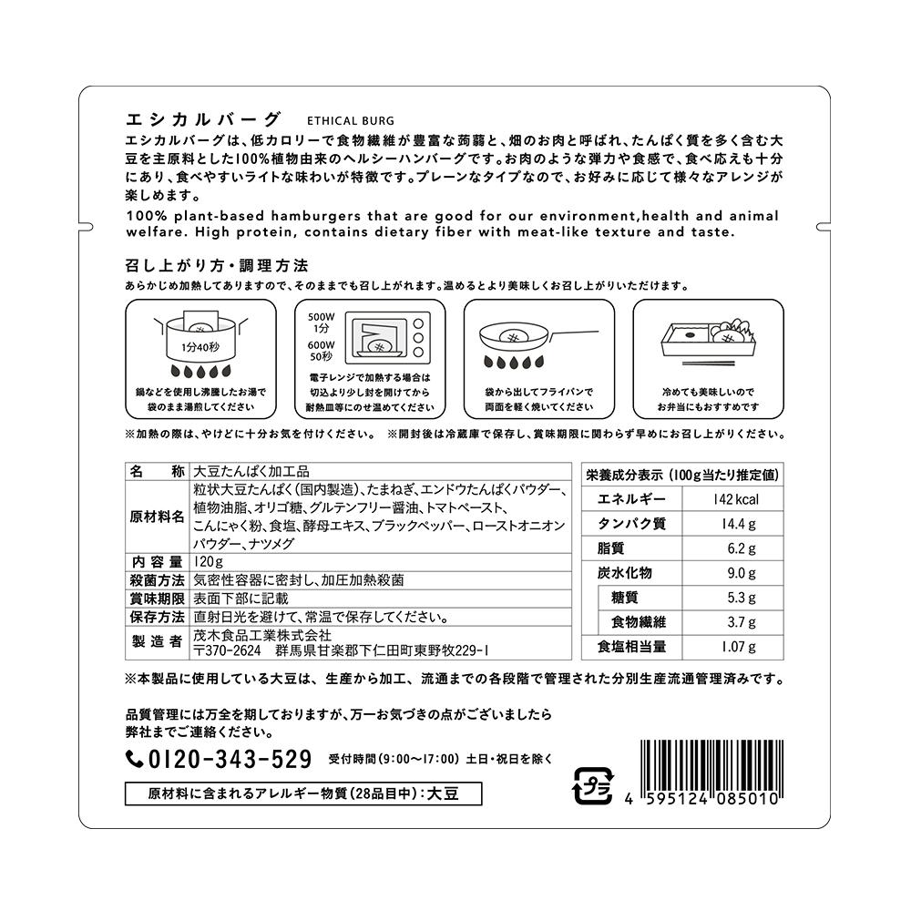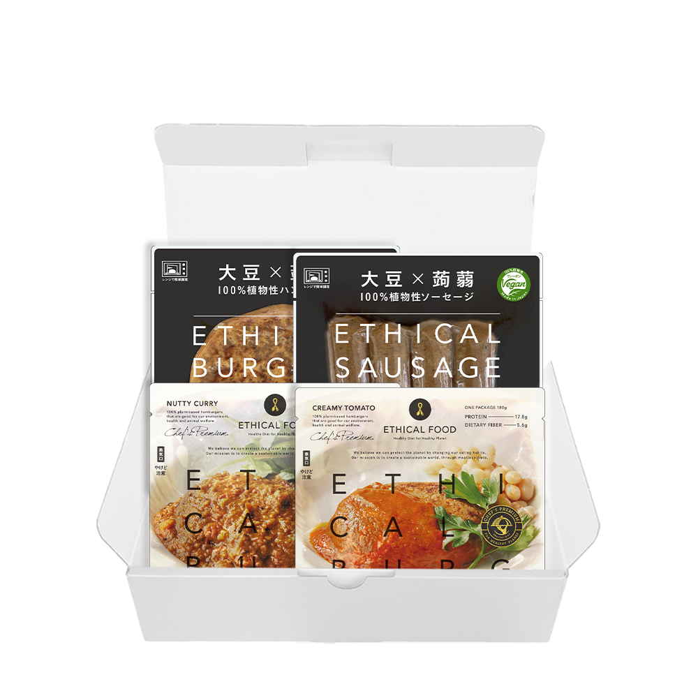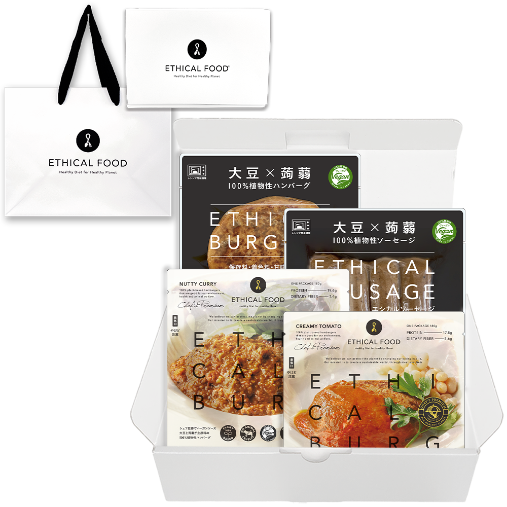 - ・エシカルバーグ:粒状大豆たんぱく(国内製造)、たまねぎ、エンドウたんぱくパウダー、植物油脂、オリゴ糖、グルテンフリー醤油、トマトペースト、こんにゃく粉、食塩、酵母エキス、ブラックペッパー、ローストオニオンパウダー、ナツメグ