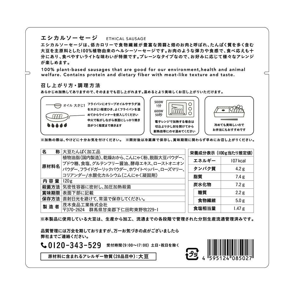 - ・エシカルソーセージ:植物油脂(国内製造)、乾燥おから、こんにゃく粉、脱脂大豆パウダー、ブドウ糖、食塩、グルテンフリー醤油、酵母エキス、ローストオニオンパウダー、フライドガーリックパウダー、ホワイトペッパー、ローズマリー、コリアンダー/水酸化カルシウム(こんにゃく凝固剤)